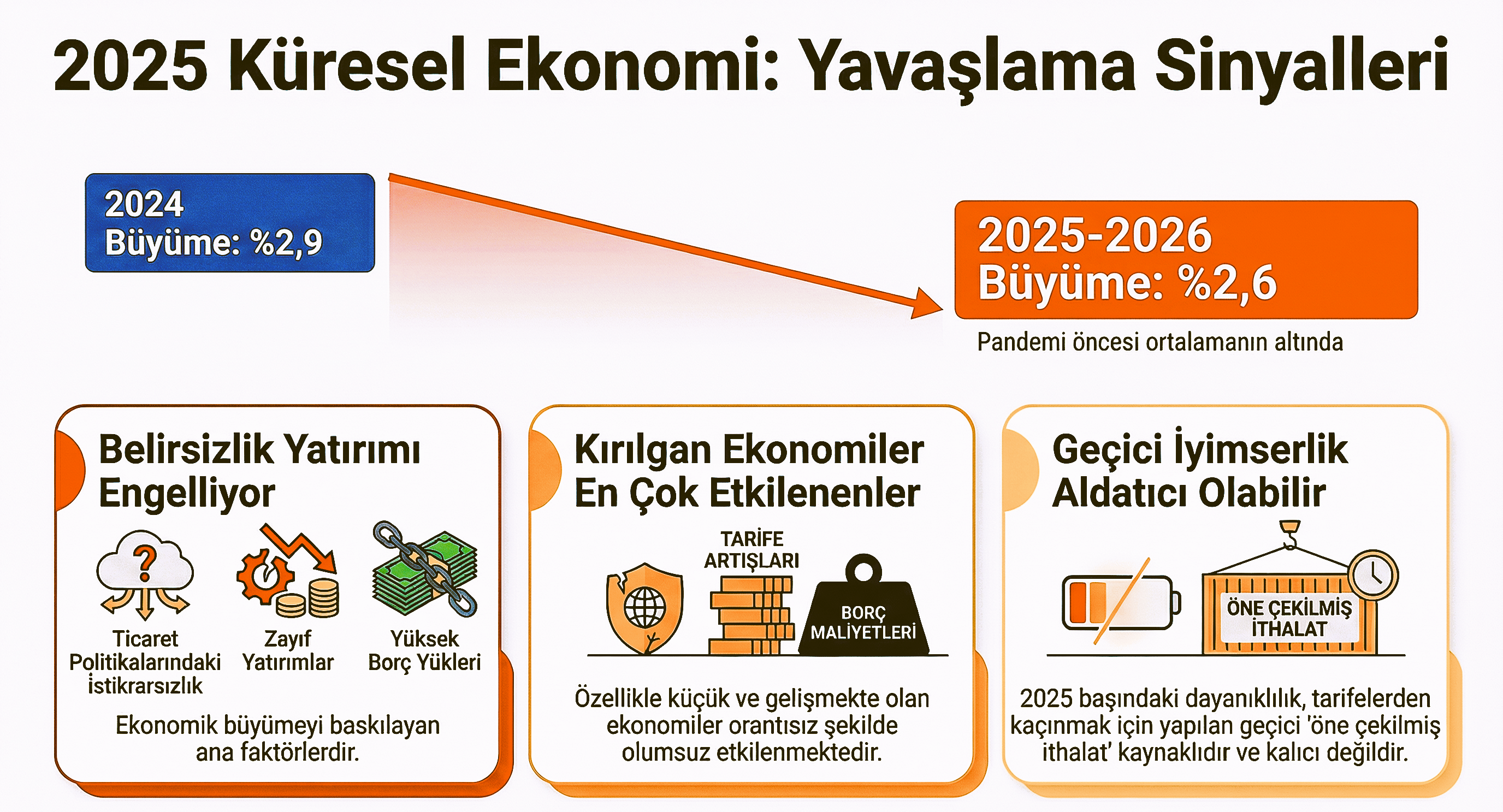 Sonuç olarak, küresel büyümenin 2024 yılındaki %2,9 seviyesinden 2025'te %2,6'ya yavaşlaması öngörülmektedir. Bu genişleme hızı, halihazırda düşük sayılabilecek pandemi öncesi ortalamanın (2016–2019) %0,4 puan altında kalmaktadır.