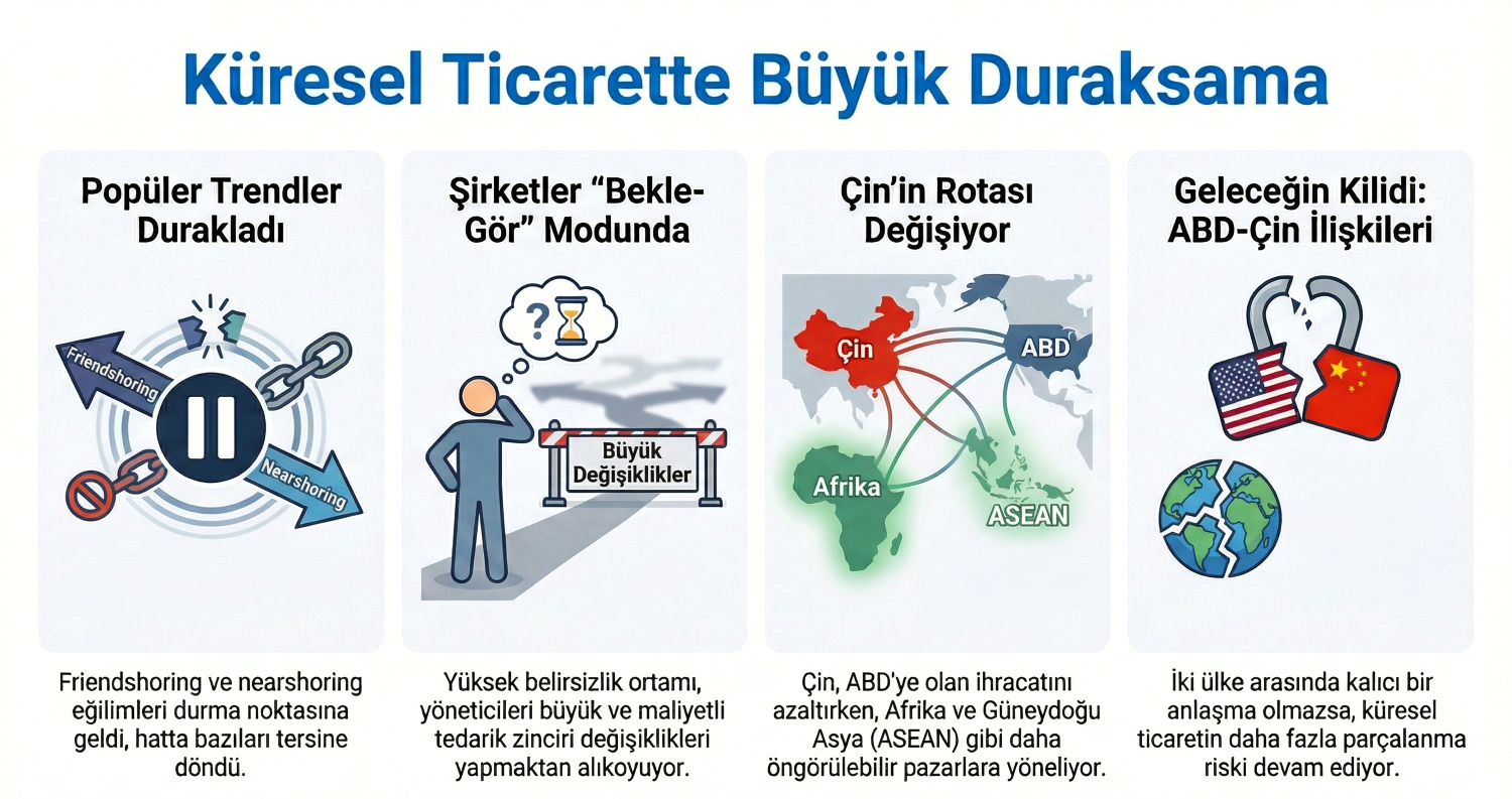 “Dost ülkelere yönlendirme” (friendshoring) ve “yakın coğrafyaya taşıma” (nearshoring) stratejileri, 2024’ün sonu ve 2025’in başı itibarıyla belirgin bir ivme kaybına işaret etmekte, bazı göstergeler bu eğilimlerin geçici olarak durakladığını, hatta kısmen tersine döndüğünü düşündürmektedir.